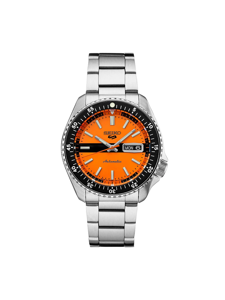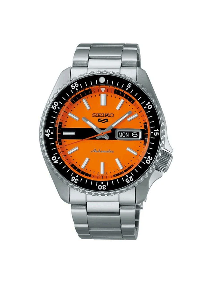 El Seiko 5 Sports SRPK11K1 es un reloj que combina la robustez de la línea Seiko 5 con un diseño llamativo gracias a su esfera en color naranja. Su caja de acero inoxidable de 42 mm y su bisel giratorio unidireccional le otorgan un carácter deportivo y funcional, ideal para quienes buscan un reloj con presencia y confiabilidad.