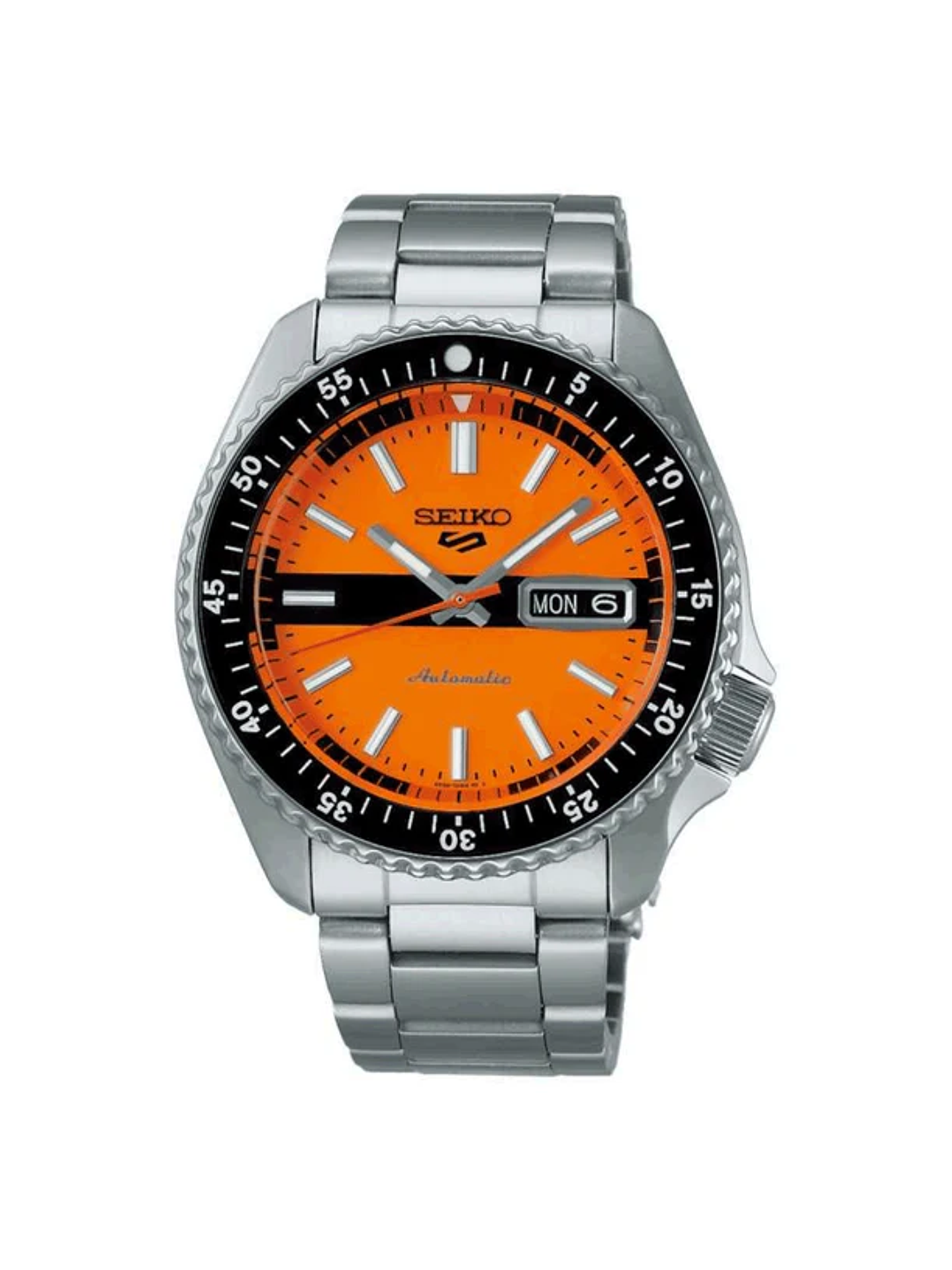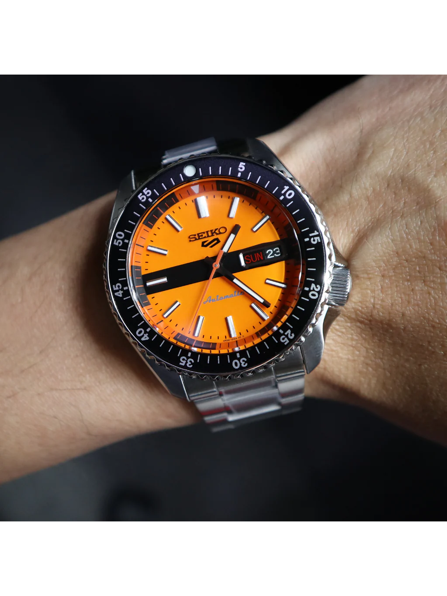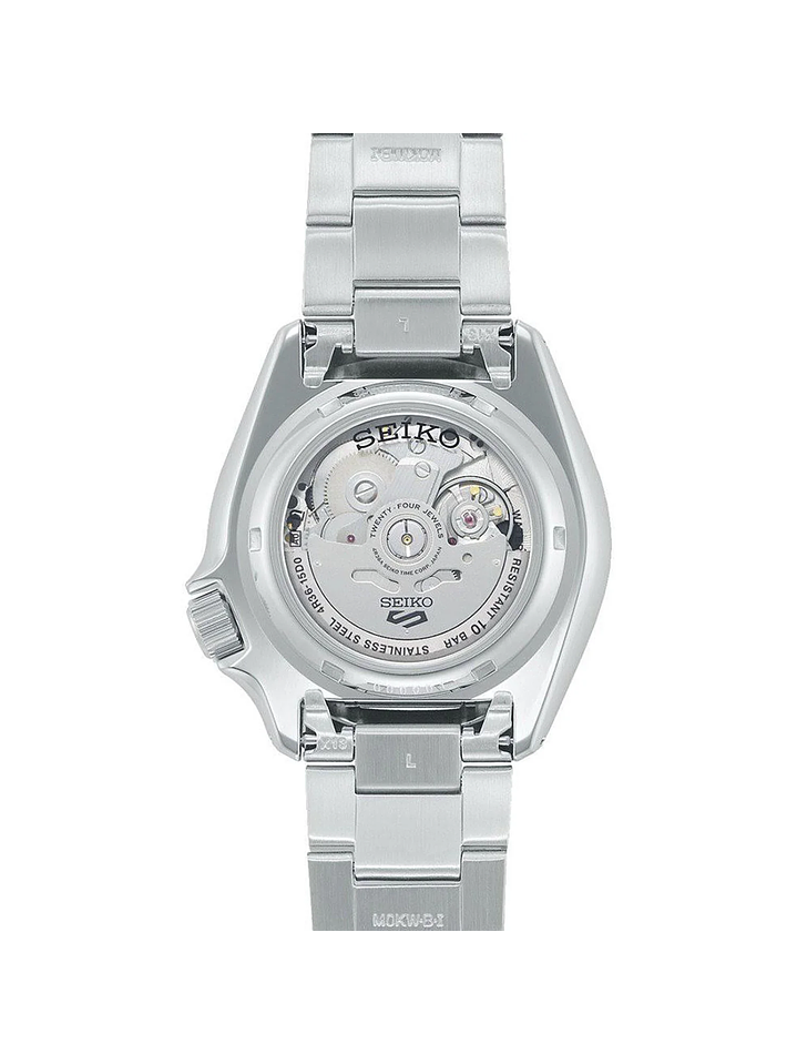 - Movimiento automático Seiko Caliber 4R36 con 24 rubíes y frecuencia de 21,600 vph.