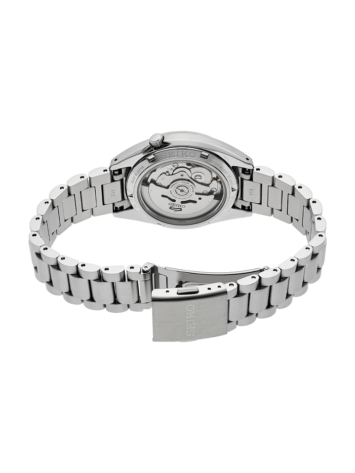 - Movimiento automático Seiko Caliber 4R36 con 24 rubíes y frecuencia de 21,600 vph.